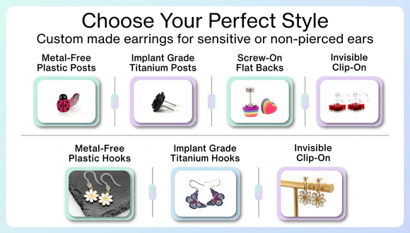 At Pretty Smart Earrings, comfort comes first—without sacrificing style. Every pair is handcrafted with 100% nickel-free, hypoallergenic materials designed for even the most sensitive ears. From implant-grade titanium posts to metal-free plastic studs, screw-on flat-backs, and invisible clip-ons, we’ve created comfortable options for everyone—pierced or not.