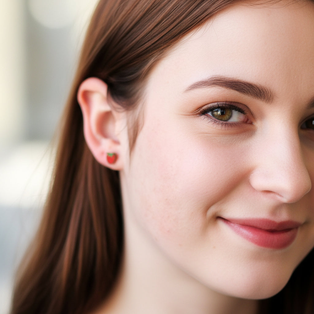 Stainless steel dainty strawberry stud earrings for sensitive ears.