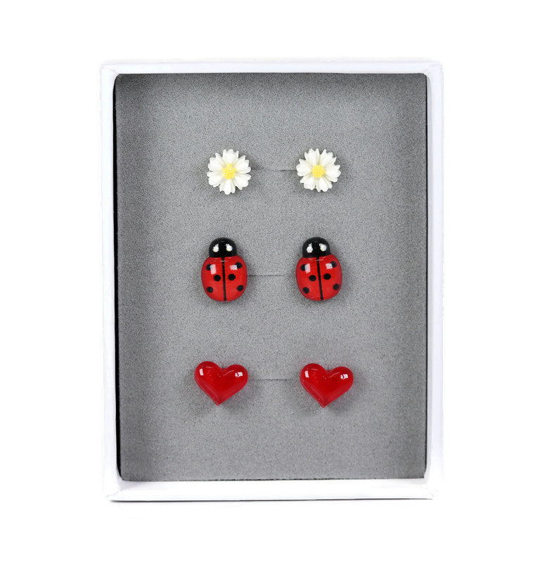 Boucles d'oreilles à tige marguerite, coccinelle et cœur rouge - Coffret cadeau