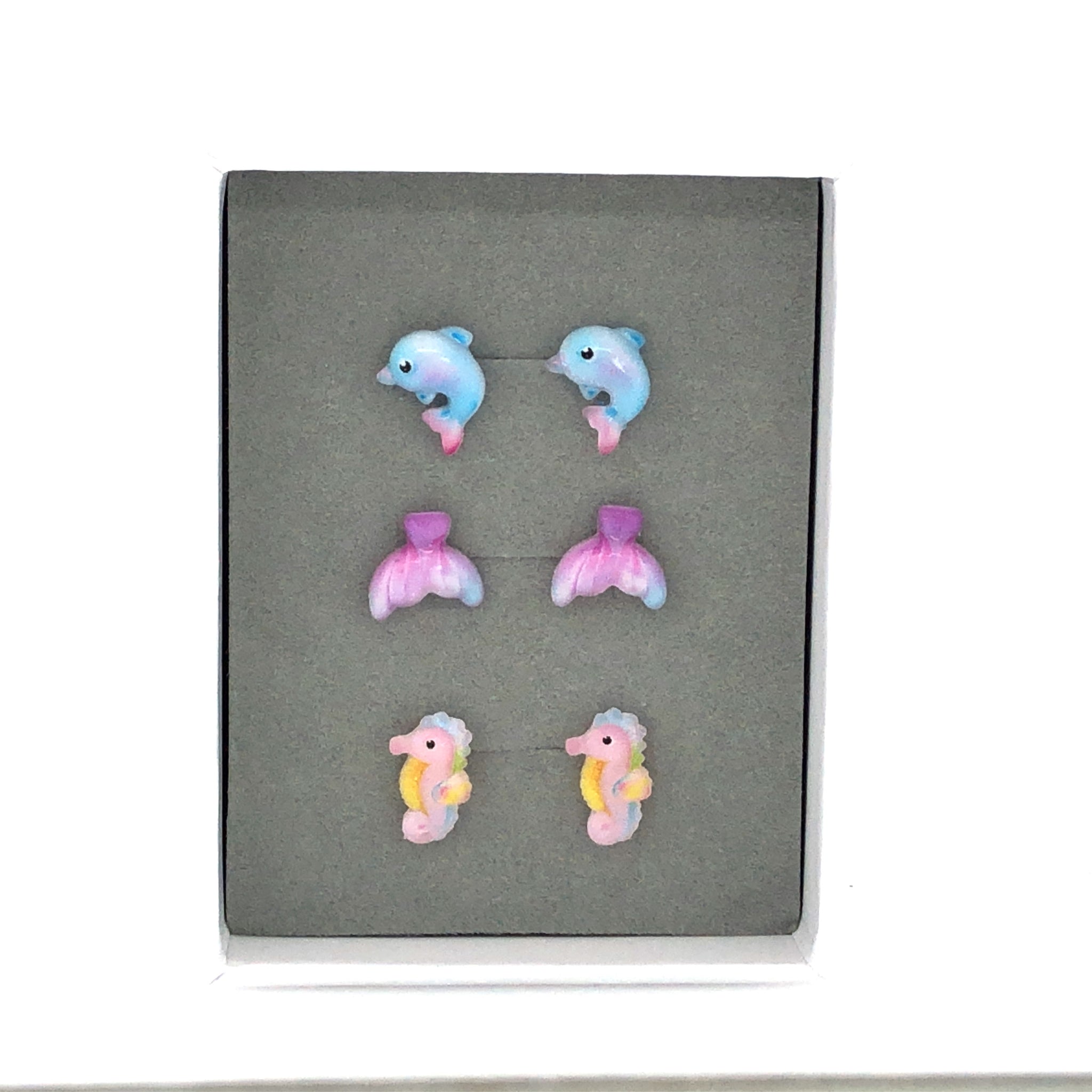 Coffret cadeau de boucles d'oreilles à tige avec dauphin, queue de sirène et hippocampe