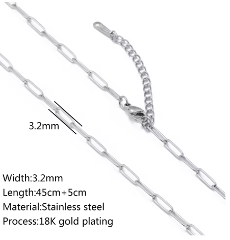 Ajoutez une touche d'élégance moderne avec ce collier trombone de 3,2 mm. Dotée de maillons rectangulaires allongés, cette chaîne élégante et contemporaine est une déclaration de minimalisme raffiné. Sa finition polie et son design léger le rendent parfait pour être superposé ou porté seul pour un look chic sans effort. Soigneusement conçu pour la durabilité et le confort, ce collier épouse parfaitement la peau, alliant style et praticité au quotidien.
