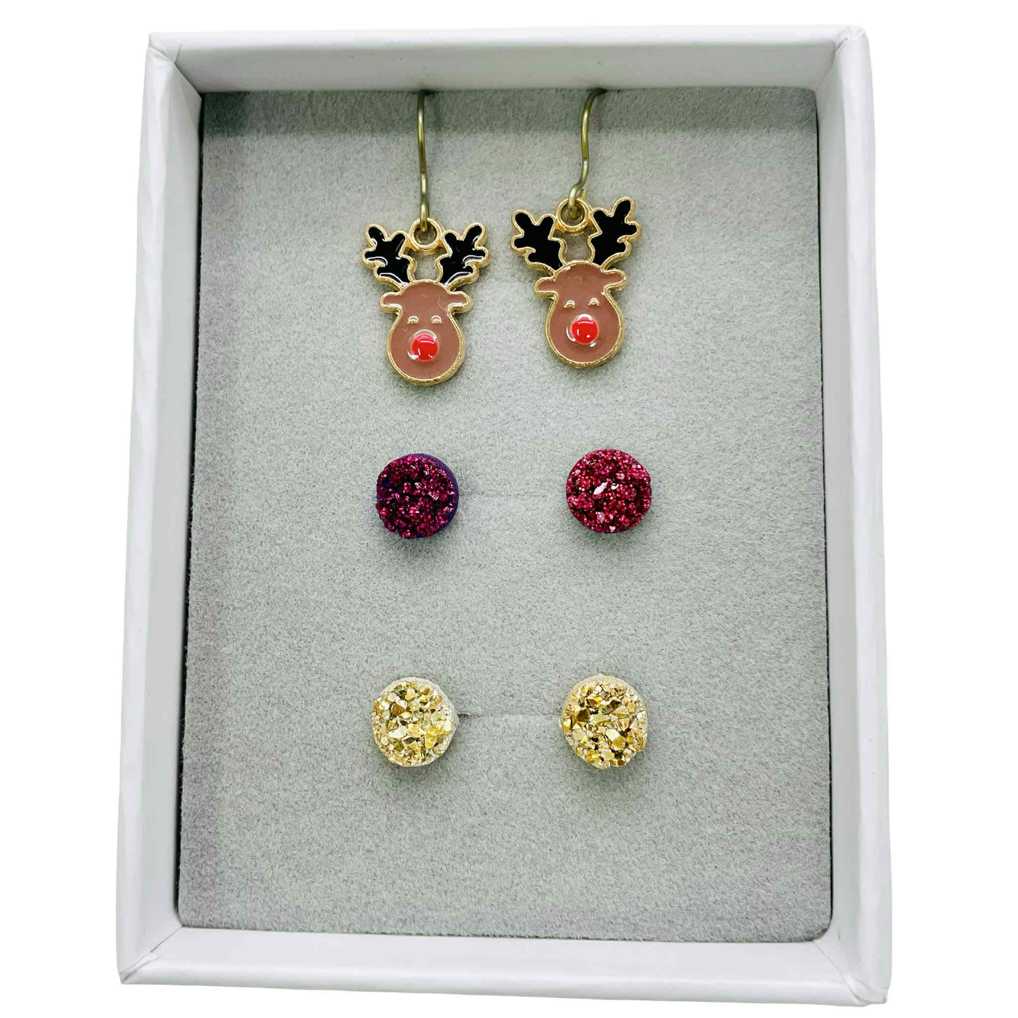 8mm Druzy Burgundy, Gold & Reindeer Dangle - Earrings Set