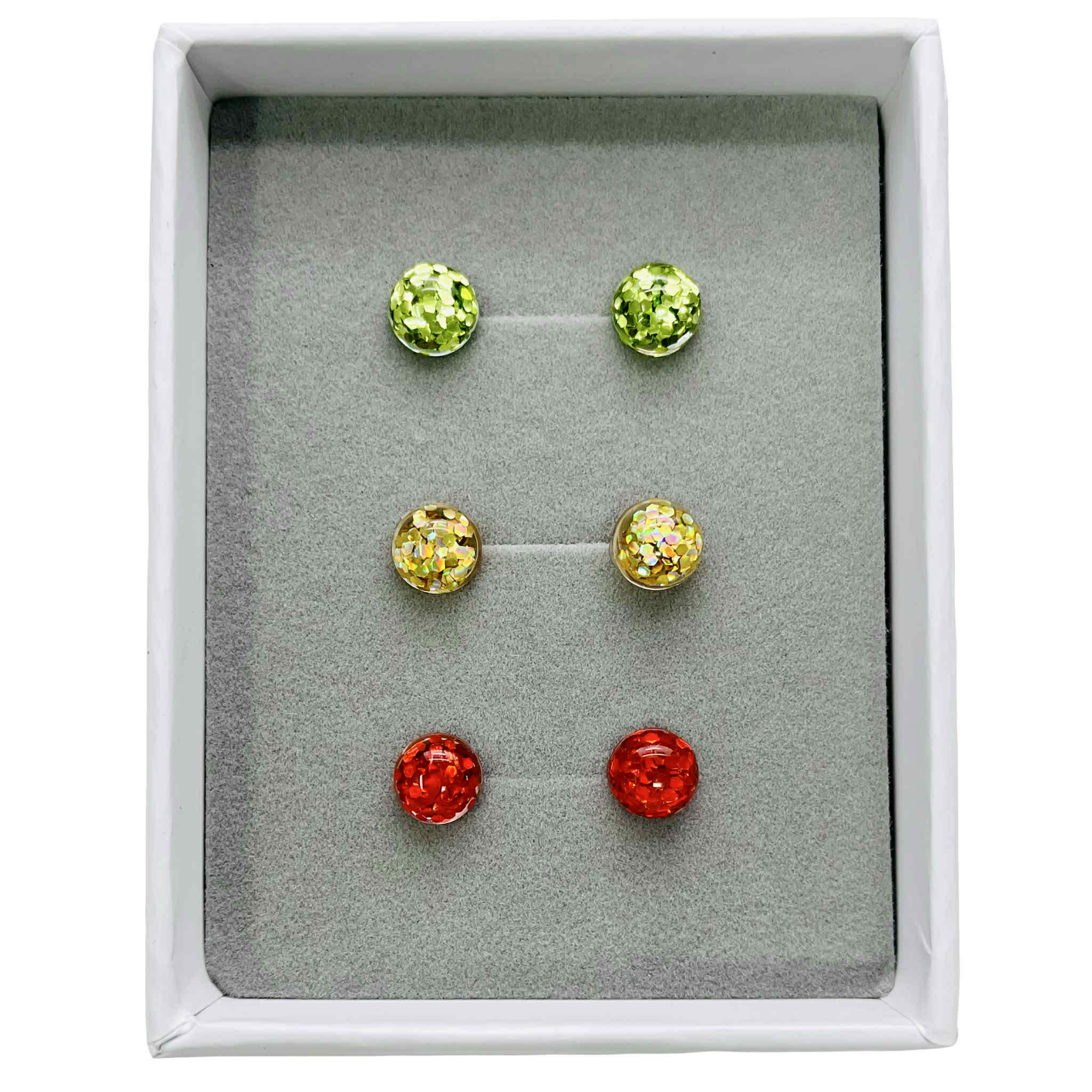 8mm Glitter Cabochons, Green, Gold, Red- Stud Earrings Set